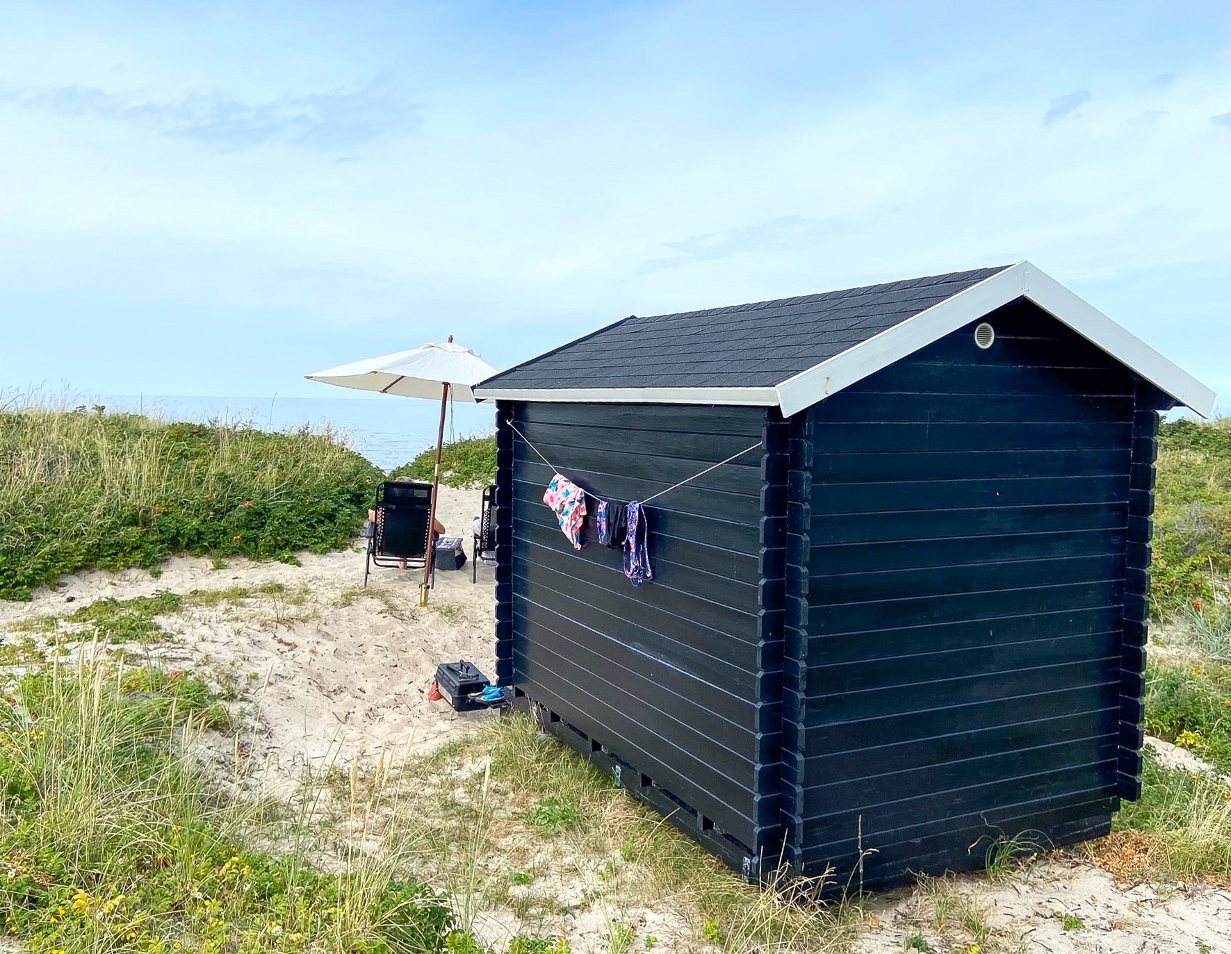 Anette og familien har forvandlet et Maggi 1c fra Sølund Huse til et roligt badehus på stranden i Tisvilde. Her mødes de med venner og familie til picnic i sommermånederne.