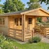 Klassisk bjælkehus med stor overdækket terrasse til have, ideel til anvendelse som kolonihavehus eller anneks