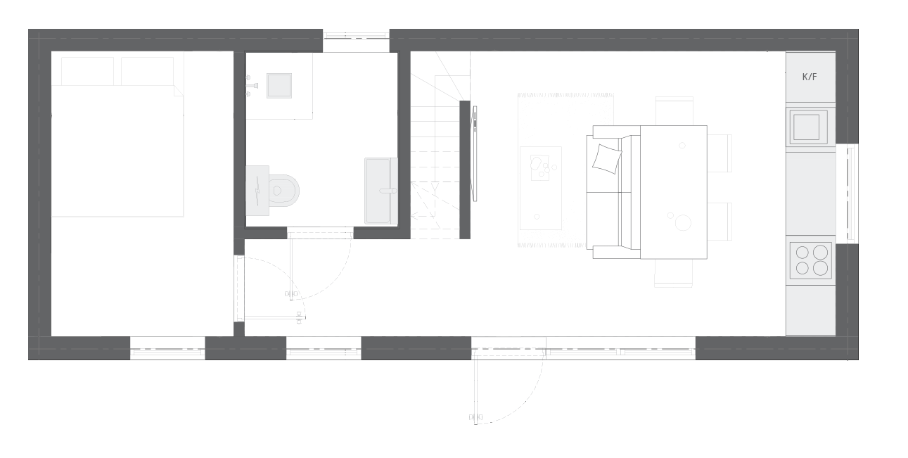 Bemærk: Elin er projekteret efter sommerhuskravene og adskiller sig på alle måder fra vores havehuse, som er tiltænkt som sekundær bebyggelse uden overholdelse af kravene til længerevarende ophold og beboelse.